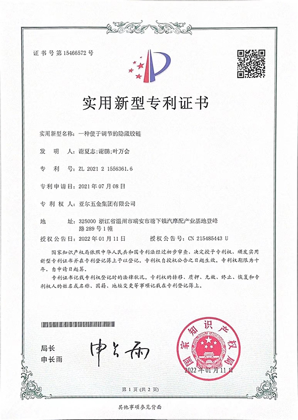 一种便于调节的隐藏铰链实用新型专利证书
